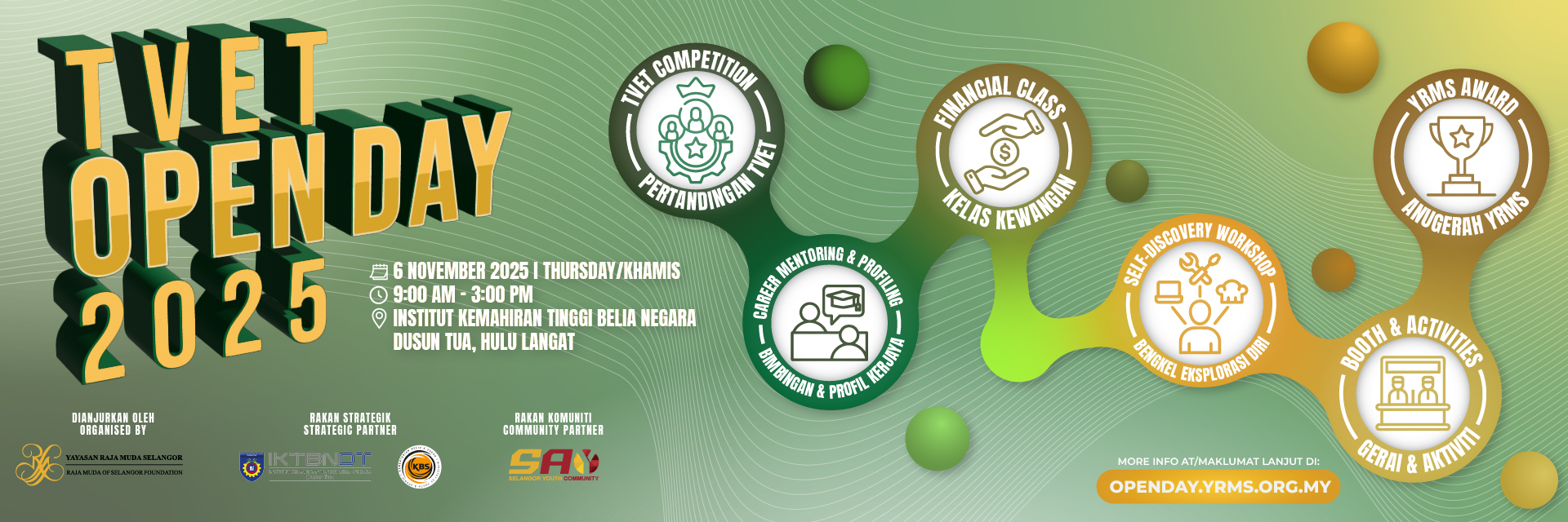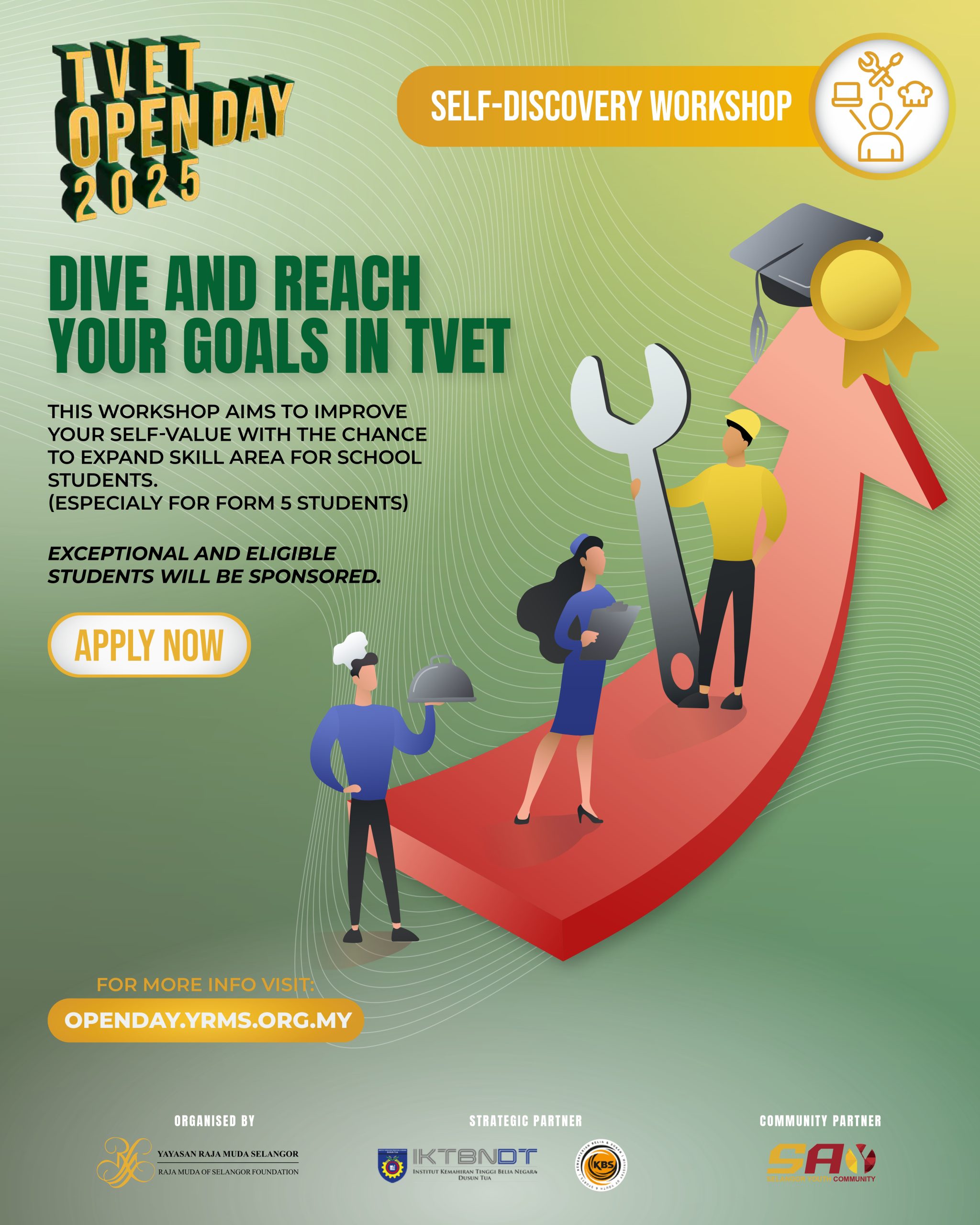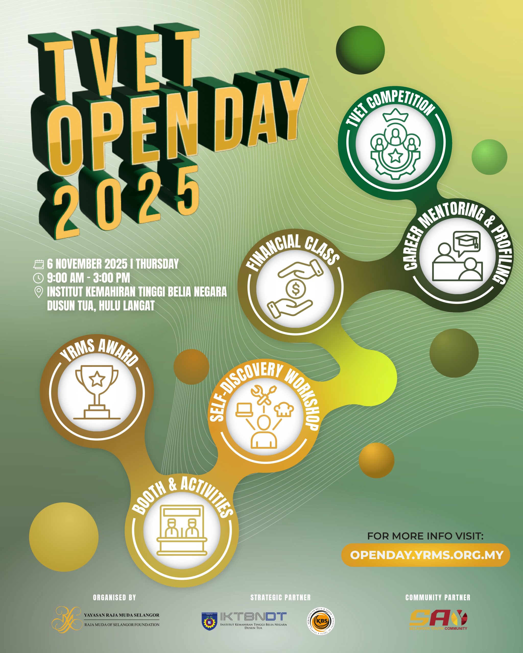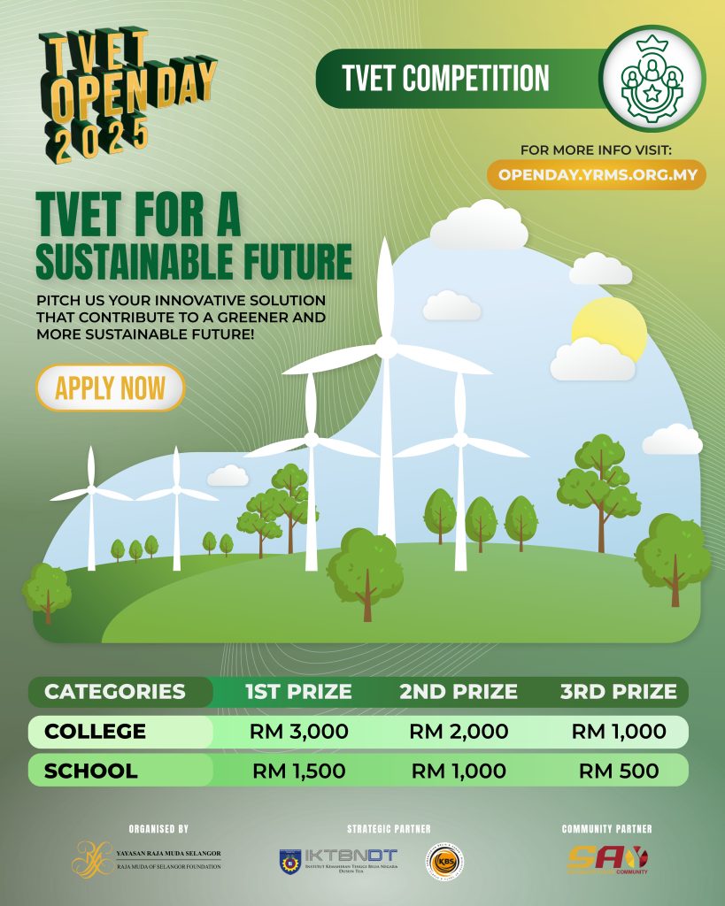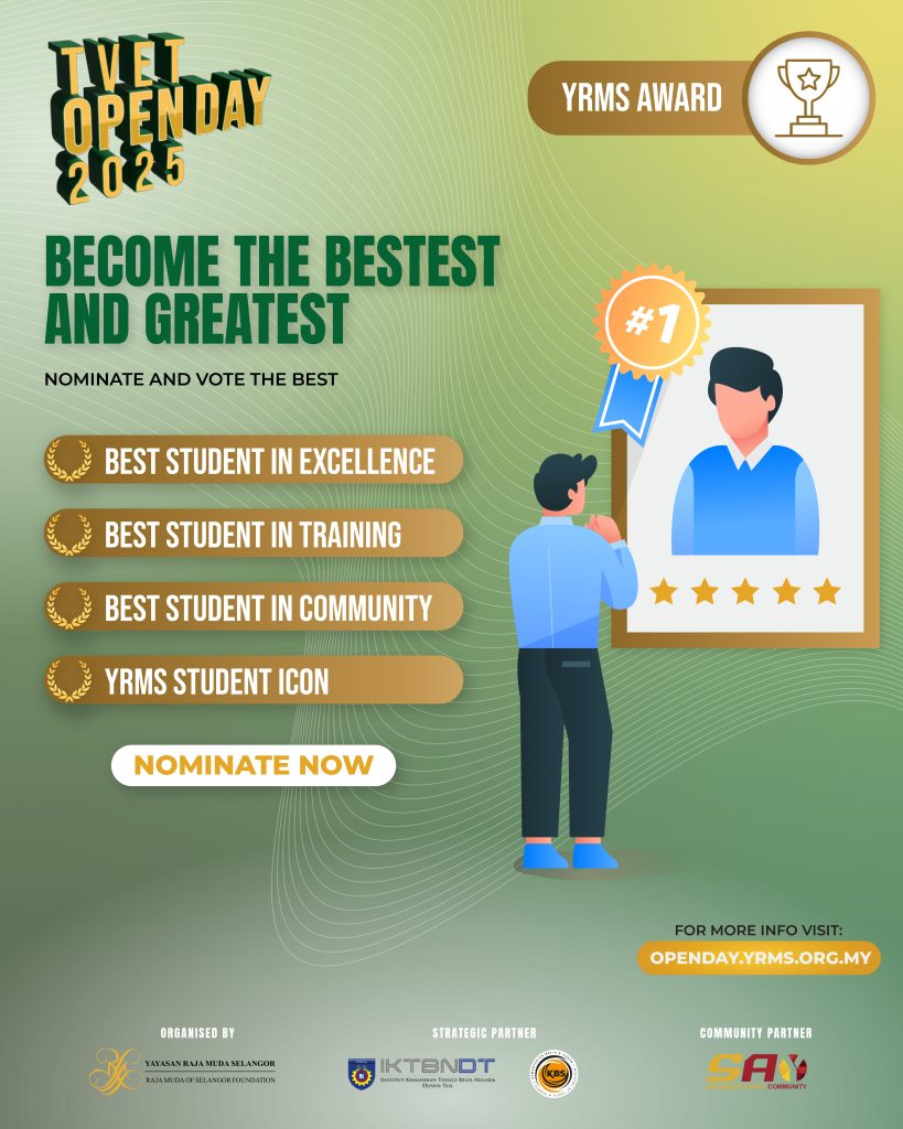 YRMS TVET Open Day is an annual platform for Yayasan Raja Muda Selangor to reach out to the community and provide content that has a positive impact and benefits our students, community and alumni through various collaborations, activities and strategic partnerships. For 2025, this open day will take place on 6th November 2025 at Institut Kemahiran Tinggi Belia Negara Dusun Tua, Hulu Langat, Selangor.